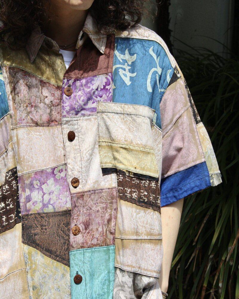 A rayon shirt from the 1990s. A very crowded structure with various patterns of rayon fabric patchworked. The art pattern has an ethnic and Art Nouveau feel, and the fabric is used for the backing to create a unique atmosphere. M size but a big silhouette with a more relaxed feeling. It has a small hole in the pocket and is in good condition subjectively. Since it is an old product, it rarely deteriorates over time. Please check the photo and purchase after acknowledging the characteristics of vintage.