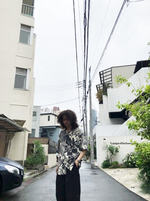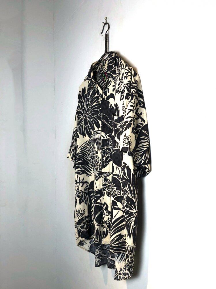 90s short-sleeved rayon shirt White x black monotone color Botanical pattern that feels Japanese elements Good silhouette shirt with a moderate amount of space.