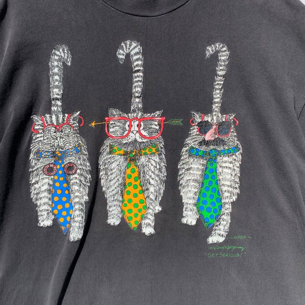 Around 1990, Carol Montgomerys [GET SERIOUS] cat print T-shirt, which has released many funny cat works.<BR> A cute design where cats with a unique touch walk side by side, and the back is printed with the cats butt.