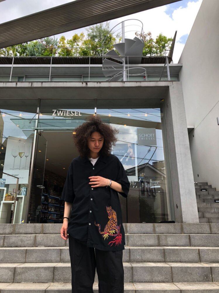 80s short-sleeved shirt Black body with oriental tiger & dragon print looks bad 1 rayon x cotton soft and smooth falling comfortable fabric feeling Loose and voluminous over-silhouette