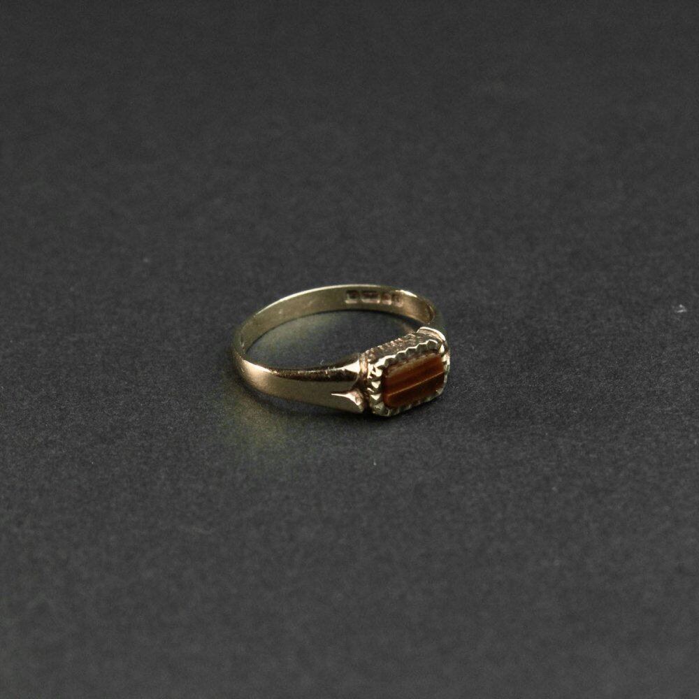 Signet ring made in England. It is the only ring that is allowed to be worn among British gentlemen who wear good things that can be used for a long time with as little waste as possible. With a rare design with a tiger eye on the top, the wood grain look is a bittersweet look. A solid appearance with a small top on a lumpy body. 375-9ct gold engraved, hallmark of London office. Please check the condition in the photo and purchase after acknowledging the characteristics of vinteg.