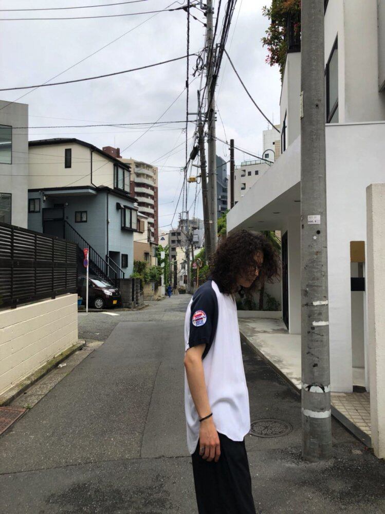 Vintage bowling shirt from the 1960s White x dark navy two-tone color with chest pockets, emblems on both sleeves, and chain stitch embroidery on the back.