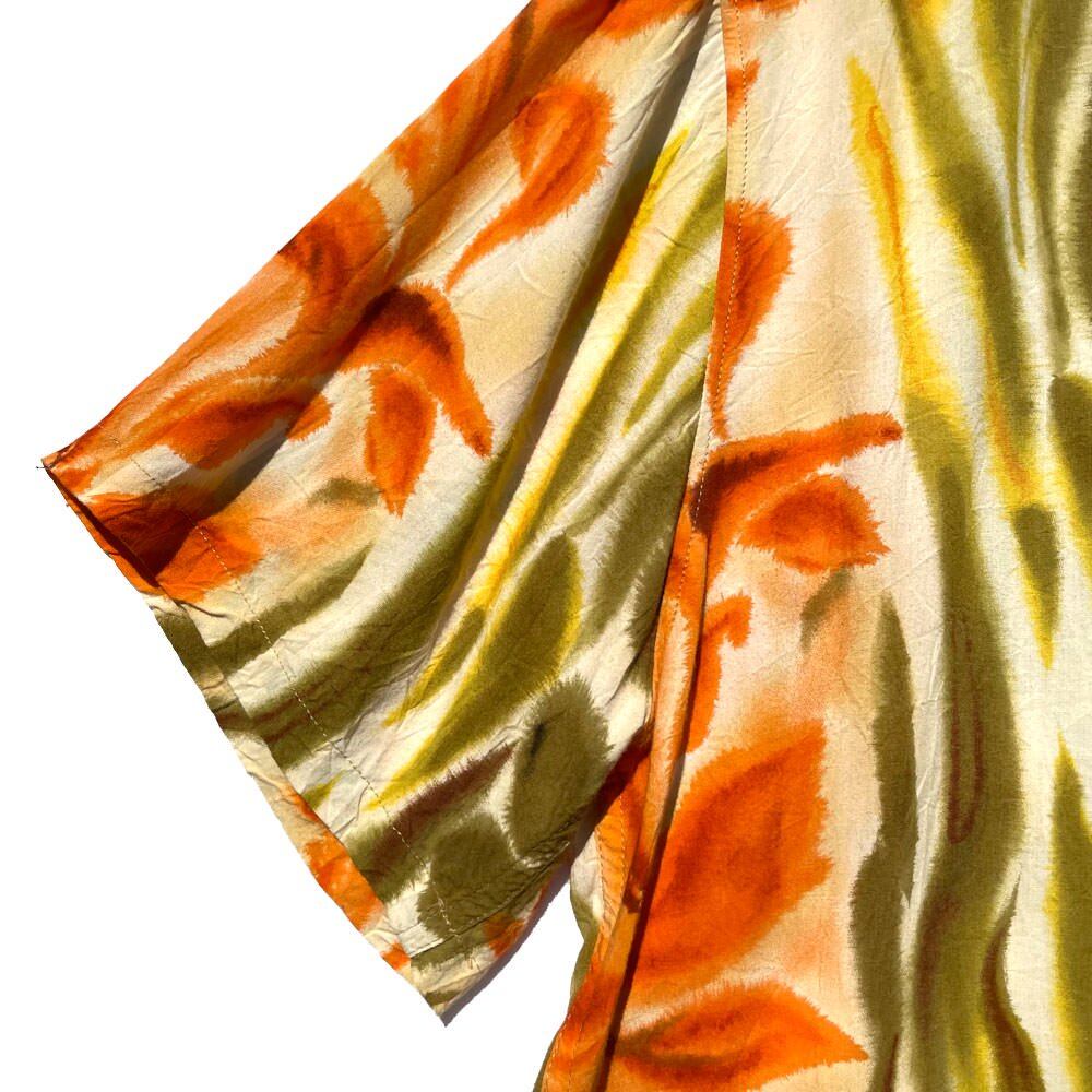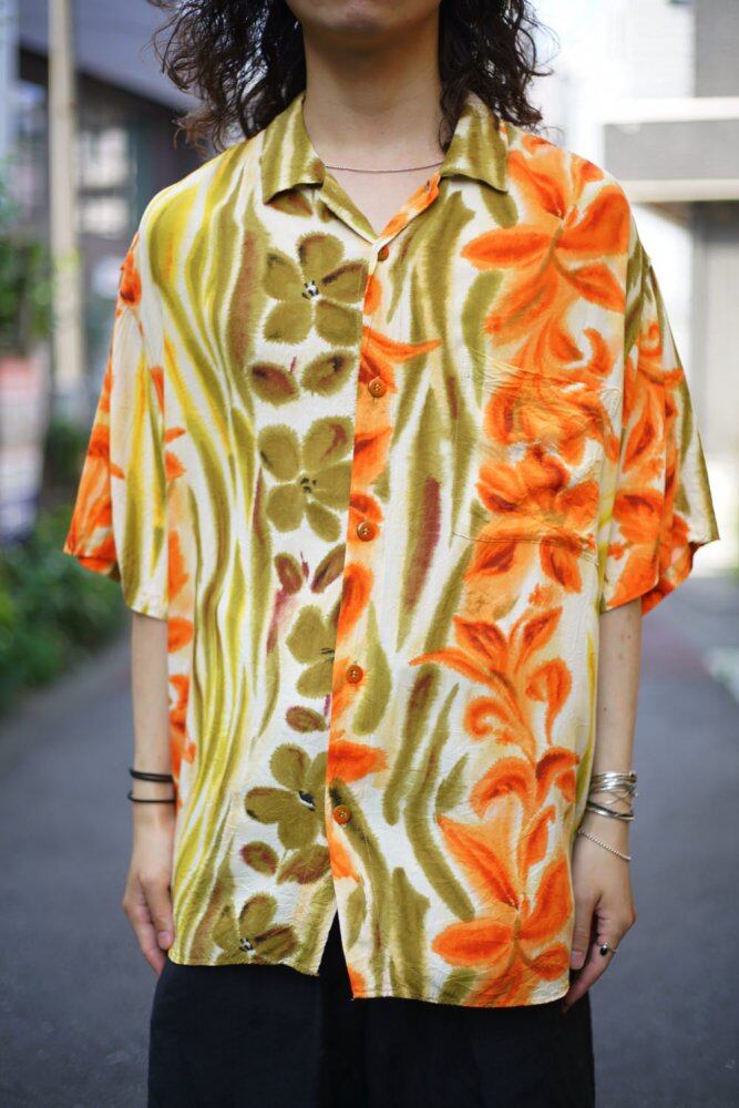 A high-quality fabric with a unique drape that is 100% rayon and smooth, and a Hawaiian print with a botanical pattern on a pale orange and olive body gives a nostalgic impression.