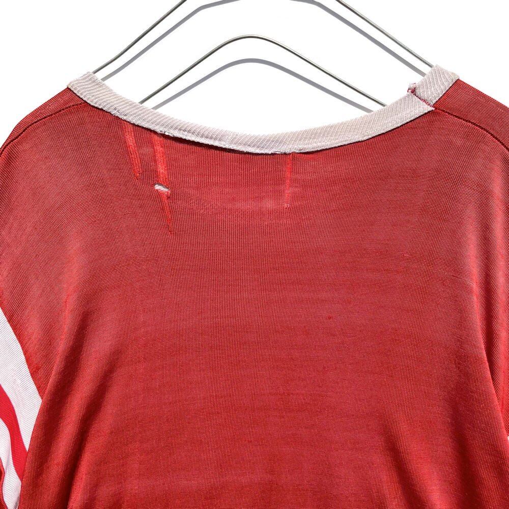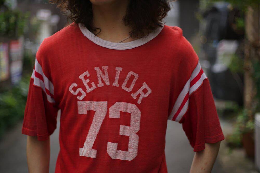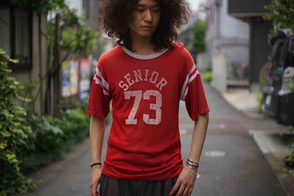 The moist and soft cotton nylon thick and unique jersey fabric has a comfortable texture, the shoulders are switched like athletic wear, and the print that has faded over time has a vintage presence.