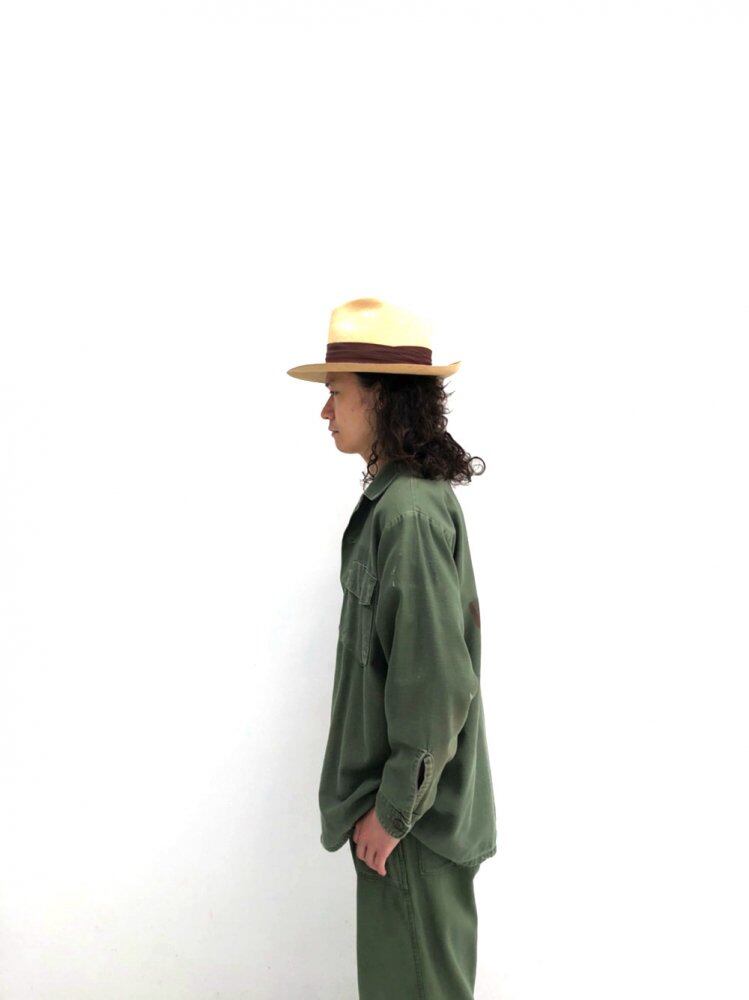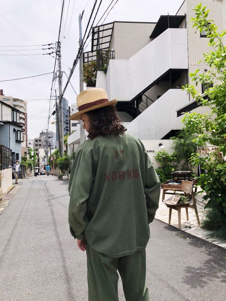 Utility shirt of the US Army in the 70s Soft and aged cotton texture and a nicely faded olive color The stencil of IT WORKS on the back is also tasty.