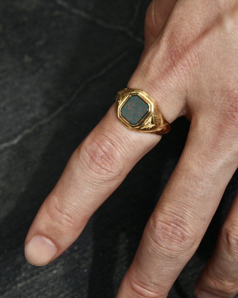 A rare signet ring made in Sweden. Top design with 18 carat yellow gold body and high quality bloodstone with deep green and red spots. When Jesus Christ was crucified, there is a so-called that fresh blood turned from a wound to a green earth or a stone. It is said to bring spiritual energy from its holiness and has a healing effect. The side is finely engraved like the Victorian period, and it seems to be a Celtic knot, but it is mysterious and elegant, and it looks like a Scandinavian Viking. It has the 1879 Hallmark and is in good condition, unlike the antiques of about 150 years ago. Made in Sweden, 18K gold hallmark. Please check the condition in the photo and purchase after acknowledging the characteristics of vinteg.