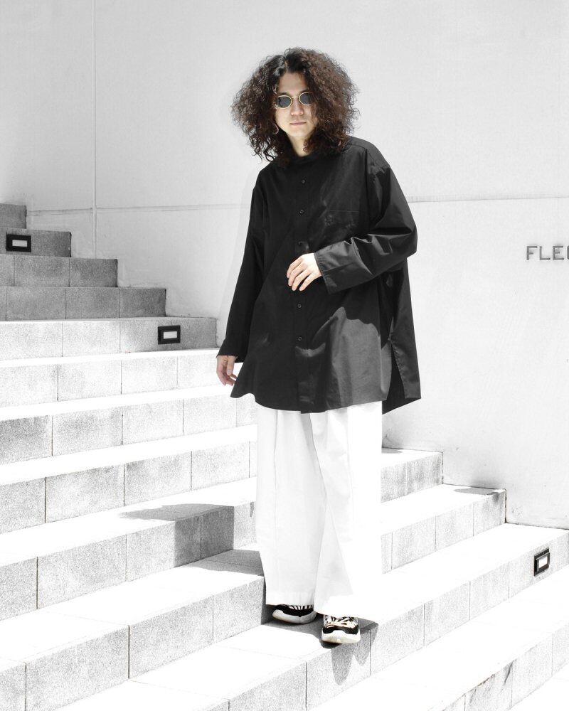 Our original pimpstick remake line dress shirt. A formal shirt made of cotton / polyester fabric that has both softness and firmness is remade on the body. An all-black color with a calm look while showing a solid feel. The collar is removed and the collar is made thinner to give a neat impression around the neck. Considering the overall balance, the sleeve length is shortened and the cuffs are removed to create a silhouette like a wide sleeve. While taking advantage of the original long length, slits are provided on the side seams to give a feeling of lacking. It is a utility item that can be worn as a haori like a cardigan. We have calculated a relaxed silhouette and dared to choose a body with a big silhouette. Since we are remaking old clothes, there are rare cases of deterioration over time. Please check the photo and understand the characteristics of Vintage before purchasing.