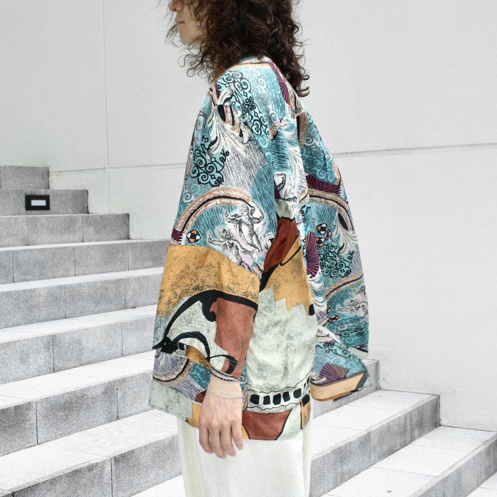 Our original pimpstick remake line silk shirt. Reconstructed using two art print shirts that were popular around the 1980s. In order to make the most of the lightness peculiar to silk fabric, we added the fabric from the best time to the sleeve on the side and extended the sleeve for a long time to create a wide silhouette like a poncho as a whole. The collar is removed and the collar is made thinner to give a clean impression around the neck, and slits are provided on the sides to create a bulging look that allows more air to escape. Looking at the balance, we added fabric to the hem and adjusted the overall pattern to make it look more cohesive. The big silhouette is suitable for haori and is light and comfortable to wear. As it is a thin silk fabric, please refrain from excessive exercise and use only dry cleaning for washing. Since we are remaking old clothes, there are rare cases of deterioration over time. Please check the photo and understand the characteristics of Vintage before purchasing.