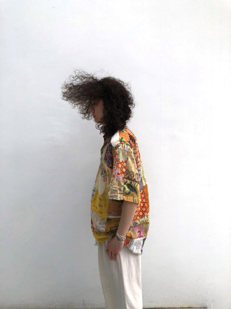 80s short sleeve shirt Beige, mustard, orange-based crazy patchwork with an ethnic atmosphere Loose oversized silhouette