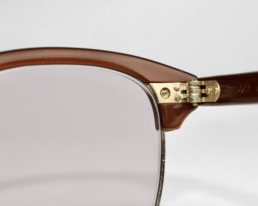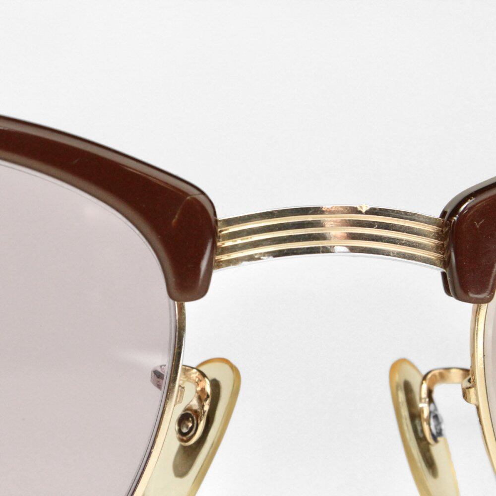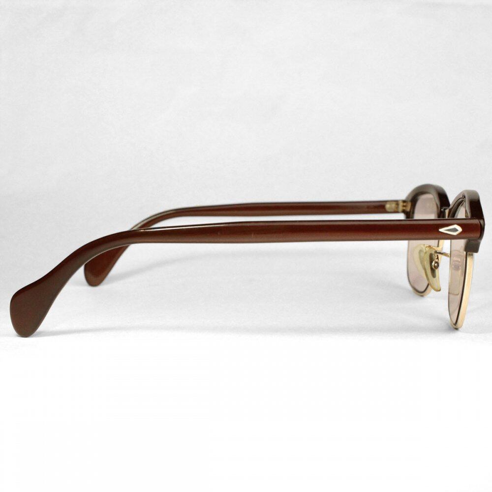 Around the 1950s Vintage [American Optical] glasses. The worlds oldest eyeglass maker, modern fashion frames are not produced and are very popular. The model Sir-Mont is a blow line design with a cell only on the upper part, which was planned by each manufacturer as a result of the explosive hit of Ronsir developed by Shuron in 1947. It is said that the name of Thurmont comes from the fact that the American military Mont officer entrusted AO with the desire to give dignity with thin eyebrows at that time. It is also famous for being always worn by Malcolm X, who liked this birds feather-like hinge. This is a precious piece from that time, with a red-brown frame and gold-plated gold specifications, giving it an elegant and dignified appearance. We have newly added a clear UV lens. Appraisal at eyeglass store, maintenance completed, * There is a small crack next to the right nose. There is no problem when wearing it, but please check in advance. We have scrutinized the condition, but since it is a vintage item, there are threads and scratches. Please purchase after understanding the characteristics of vintage and antique. All of our eyeglasses are maintained and lens replaced at the optician g room in Ebisu, Tokyo.