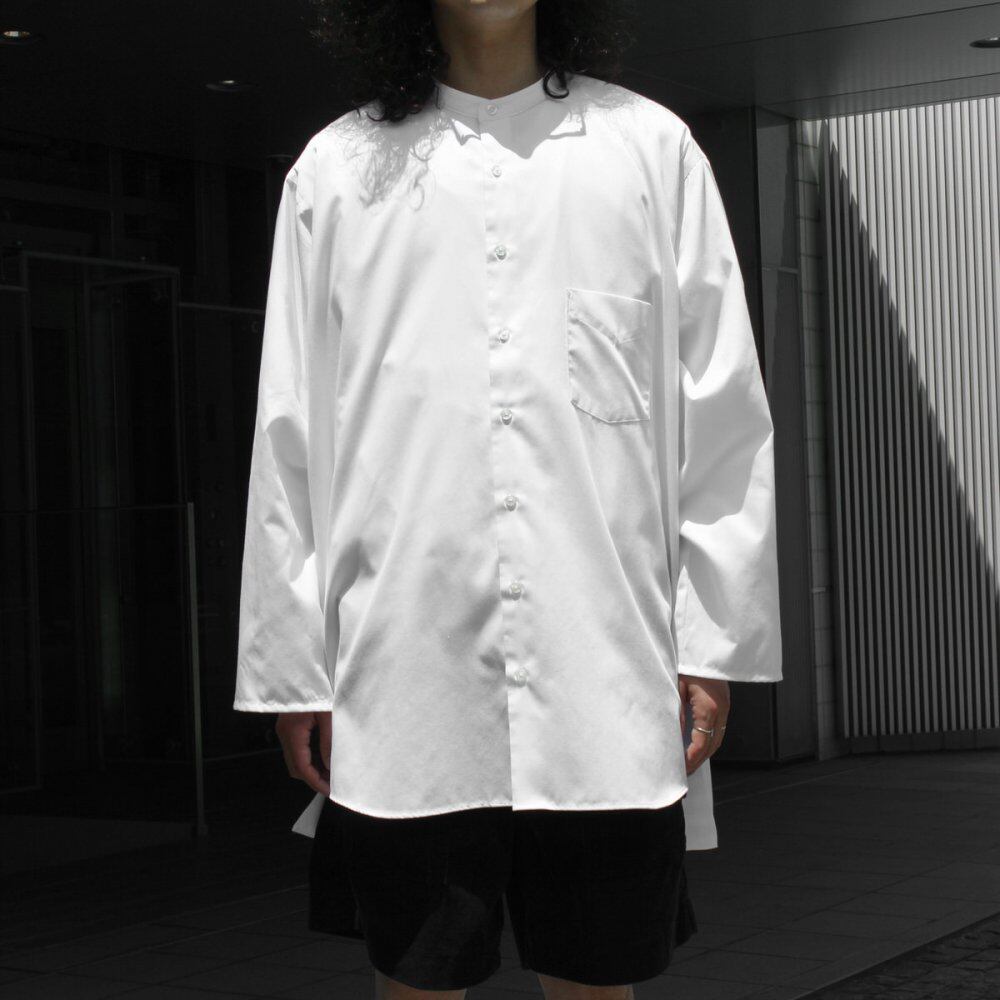 Our original pimpstick remake line dress shirt. A formal shirt made of cotton / polyester fabric that has both softness and firmness is remade on the body. An all-white color with a calm look while showing a solid feel. The collar is removed and the collar is made thinner to give a neat impression around the neck. Considering the overall balance, the sleeve length is shortened and the cuffs are removed to create a silhouette like a wide sleeve. While taking advantage of the original long length, slits are provided on the side seams to give a feeling of lacking. It is a utility item that can be worn as a haori like a cardigan. We have calculated a relaxed silhouette and dared to choose a body with a big silhouette. Since we are remaking old clothes, there are rare cases of deterioration over time. Please check the photo and understand the characteristics of Vintage before purchasing.