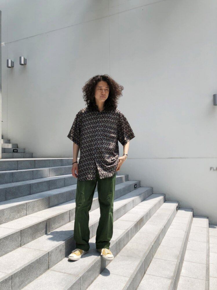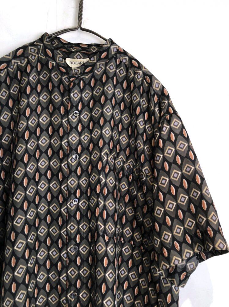 Light and smooth fabric that falls off with 100% silk. Black x gray shades and almond-shaped pattern give a unique atmosphere. A loose over-silhouette with a band color that makes the collar look neat.