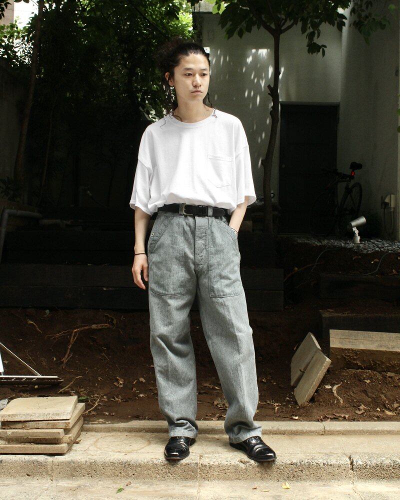 Workover pants used by the Swiss army around the 1950s. The characteristic sesame salt-colored cotton denim fabric that can be recognized as the Swiss army at a glance has an elegant look with a soft and mannish texture using a fine thread count. Aging is good over time, and the silhouette that draws a beautiful taper with plenty of space around the waist is also attractive. The slightly greenish color is also a vintage-like deep texture. Since it is old, it rarely deteriorates over time. Please note that after checking the photo.