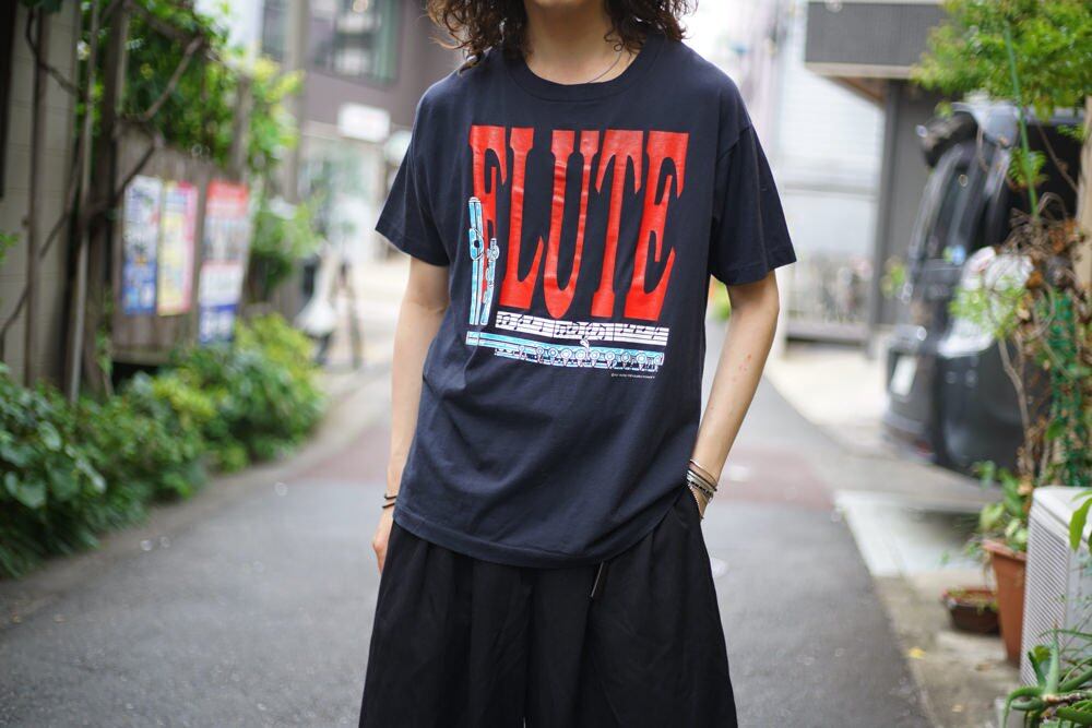 A cute piece of font, flute and musical notes printed on the chest, which is typical of the 80s.
