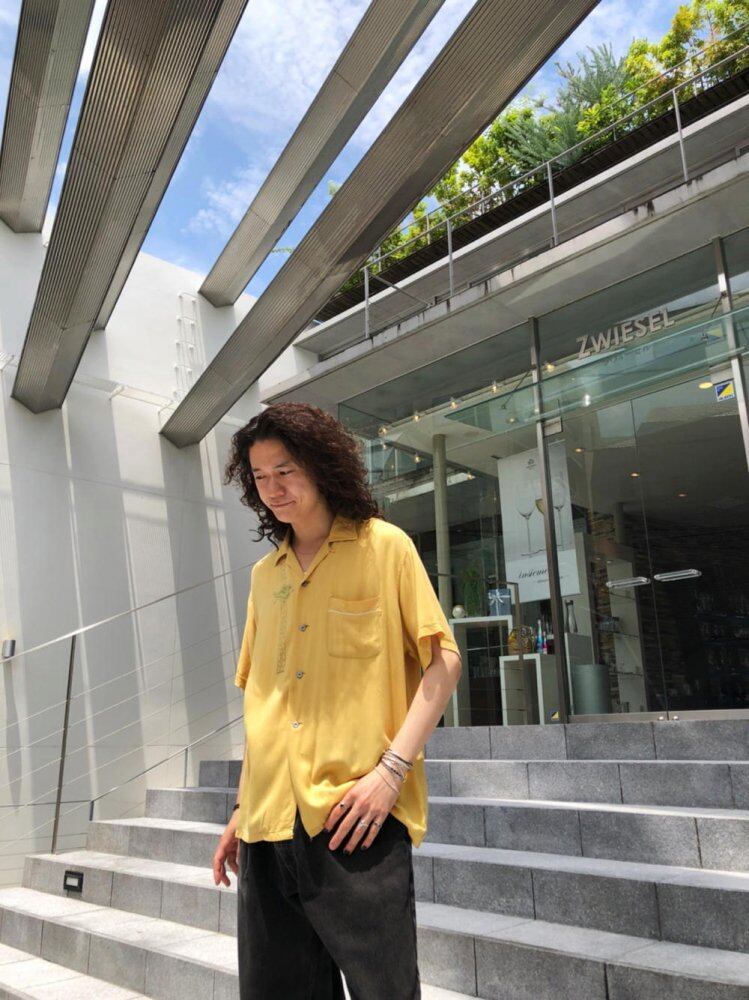 Short-sleeved rayon shirt from the 1960s A mustard color with an atmosphere and a dragon print on the chest with a three-dimensional bulge. Good silhouette shirt