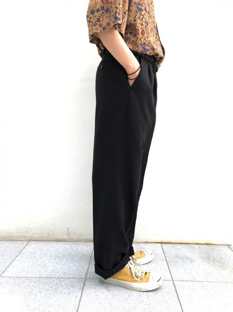 Two-tuck trouser in the 90s A black trouser with a moderately loose tapered silhouette that is easy to use. The fabric is not too thick and not too thin and can be used for all seasons.