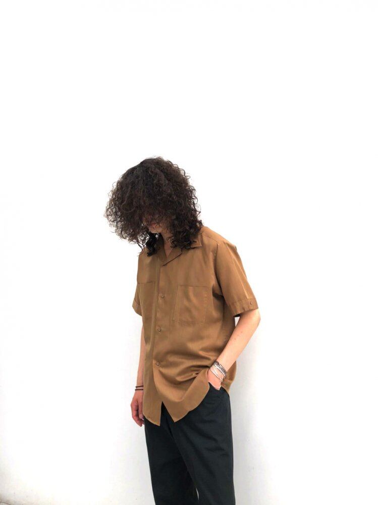 70s short-sleeved shirt Slightly glossy khaki brown shade Open-collar loop collar shirt with a masculine atmosphere Just-eye size that makes you look neat One of the thin and smooth comfort of cotton x polyester fabric