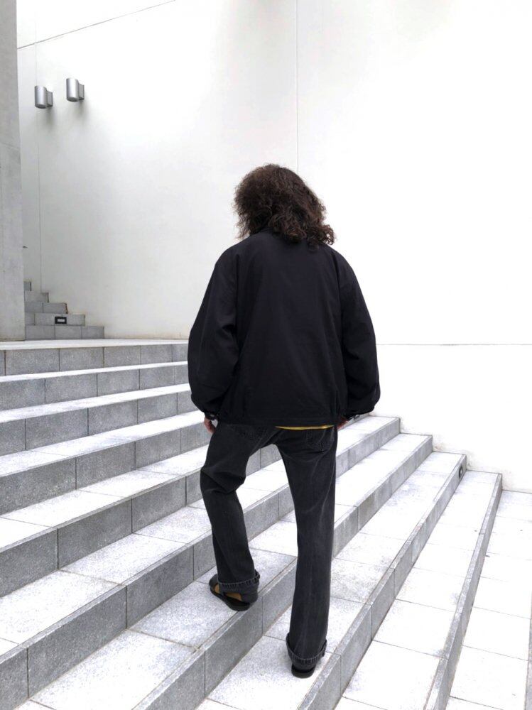 90s peach skin jacket A slightly brushed peach skin with a luxurious texture. A simple drizzler type design with a black color that is easy to use. A light jacket that is comfortable to wear and is suitable for a wide range of seasons.