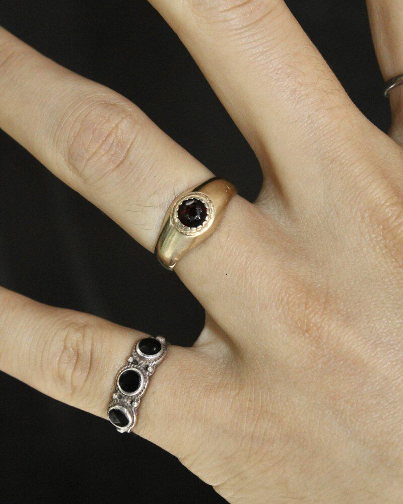 British solitaire ring. Solitair means loneliness in French and is a general term for rings with only one ore at the top. It has been used for a long time because it features a simple top design that makes the ore stand out. This is an elegant design that looks like a signet ring with a garnet on the top. The body that draws a narrow and soft curve also has an elegant appearance. 375-9ct gold, hallmark of London office. Looking at the loupe, there are scratches on the top, please check the photo. Please check the condition in the photo and purchase after acknowledging the characteristics of vinteg.