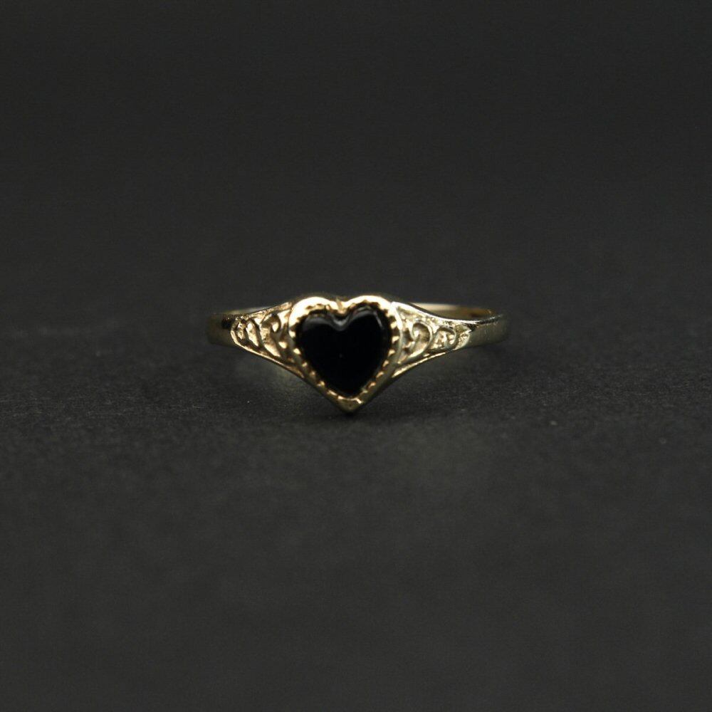 Signet ring made in England. It is the only ring that is allowed to be worn among British gentlemen who wear good things that can be used for a long time with as little waste as possible. It is a heart motif that can be seen in baby rings, eternity rings, claddagh rings, etc., but this is a very rare specification with onyx in the center. The silhouette is also a simple signet ring type and it seems that both men and women can wear it. 375-9ct Gold, Hallmark in Birmingham office. Please check the condition in the photo and purchase after acknowledging the characteristics of vinteg.