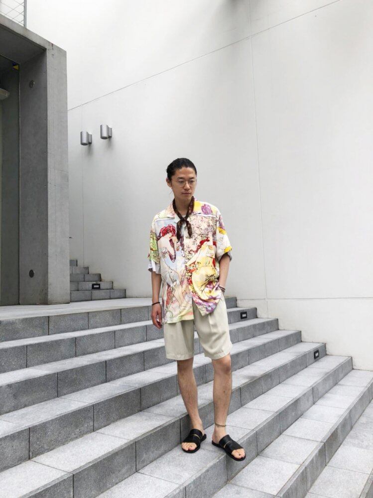Art Nouveaus leading painter Short-sleeved shirt with Alphonse Muchas paintings The wonderful artwork of Mucha, which is a perfect fusion of flowers and the curvaceous beauty of women, is feminine and soft pale color. A feeling of well-balanced size with a silhouette