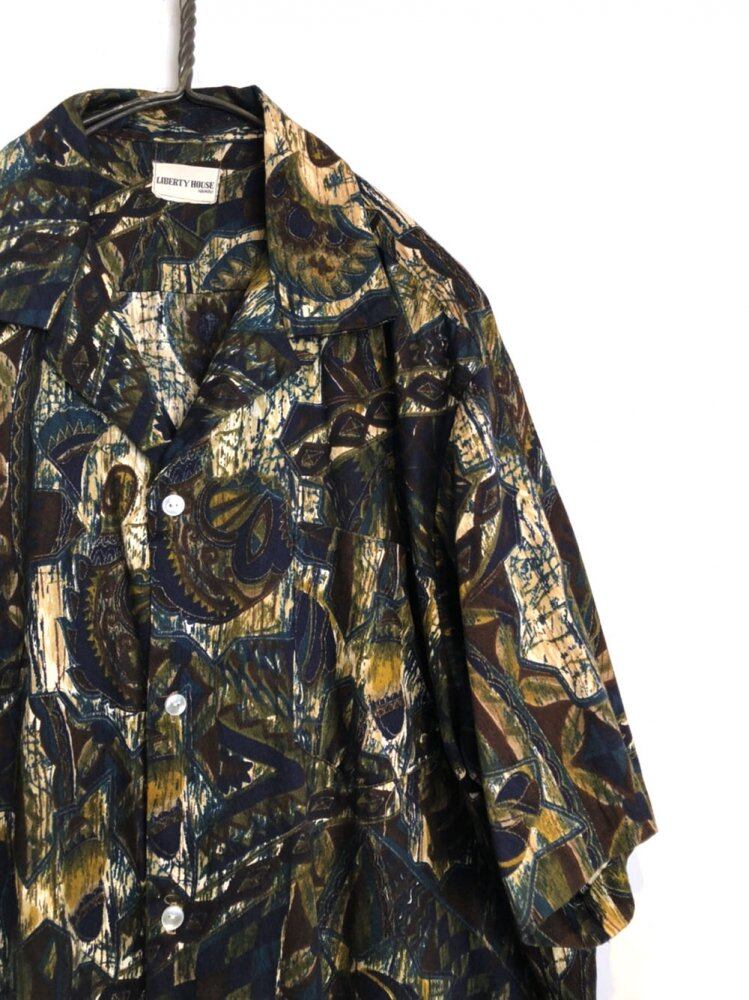 Vintage Aloha shirt from the 1960s The dark tiki pattern is very atmospheric. The cotton fabric with a textured texture is also luxurious. The loose and generous over-silhouette gives a very good size.