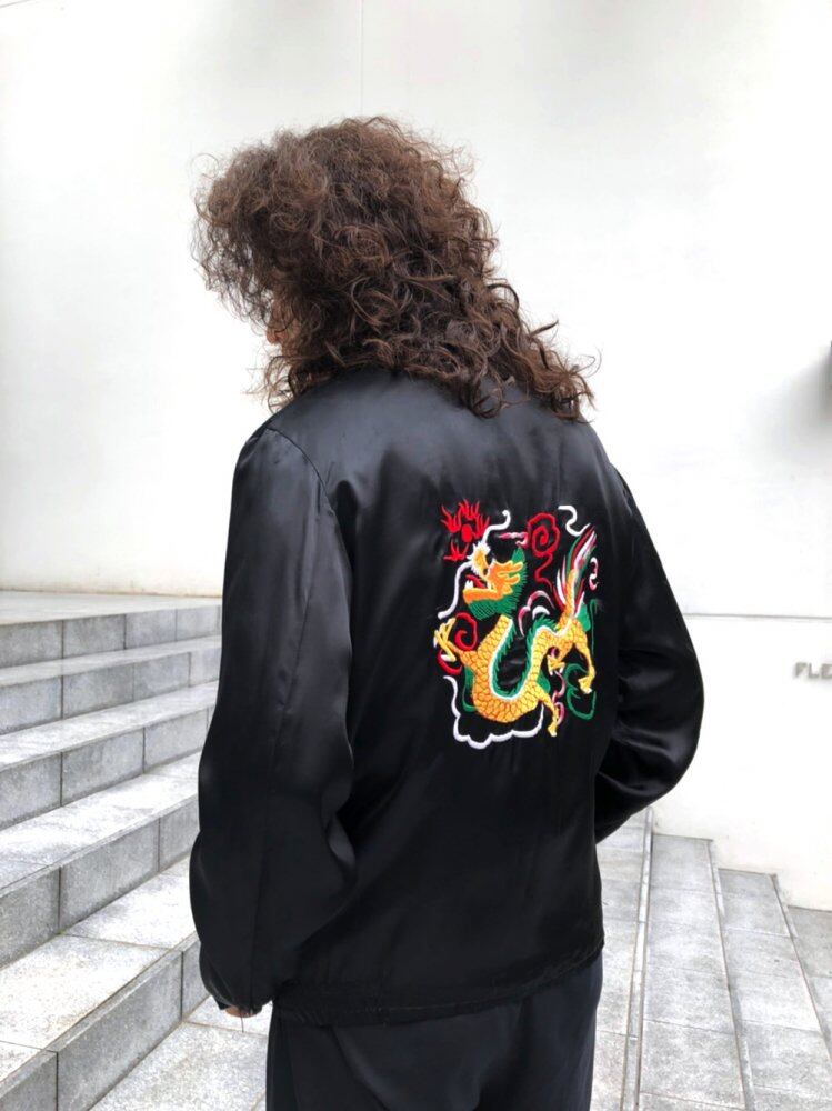 A souvenir jacket from the 1950s, made from a piece of rayon satin fabric with a feeling of falling, and a light coat like a shirt. A cool black satin with a sensual appeal and a dragon embroidery on the back. Just silhouette