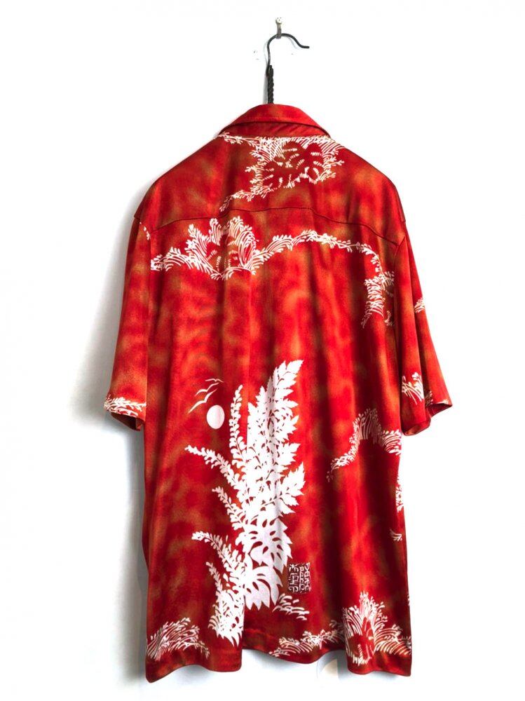 70s Vintage Aloha Shirt Romantic & Nostalgic Sunset Red Color White botanical pattern printed on glossy polyester fabric is a good atmosphere Good silhouette with plenty of room and a very good size feeling