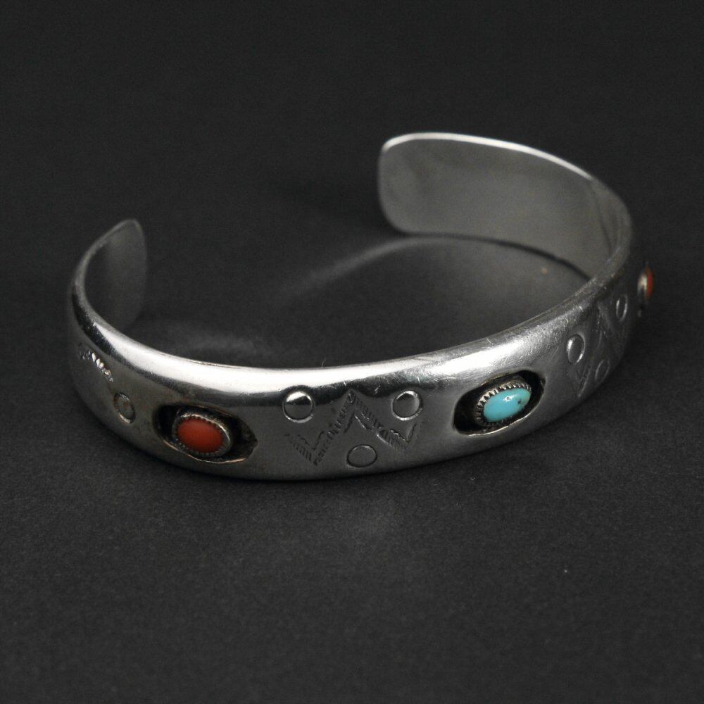 A small Navajo bangle with elegant turquoise and coral. The rounded and heavy body has the softness unique to handmade and has an earthy appearance in a good sense. The stamp stamped roughly is also a point. The writer is unknown, there is no stamp, but it is sterling silver. Please check the condition in the photo and purchase after acknowledging the characteristics of vinteg.