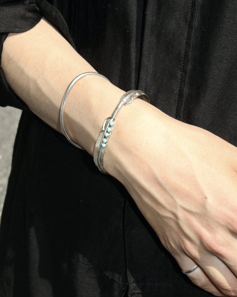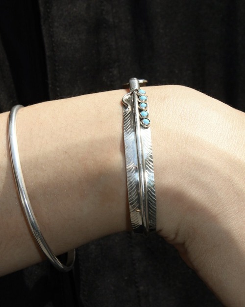 A Navajo bangle with a golden eagle feather motif. Indigenous people call it the culture of origin (Creator) and it is sacred. It is also considered to have powerful power and is used as a talisman and as a symbol of courage and power. The point here is the minimalist look of the narrow silhouette, the design tied in the middle, and the small turquoise. It is sterling silver. Please check the condition in the photo and purchase after acknowledging the characteristics of vinteg.