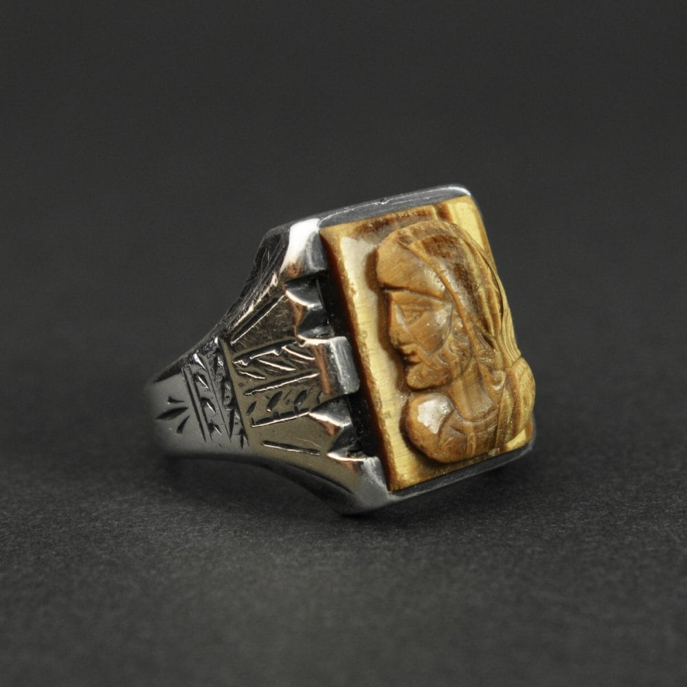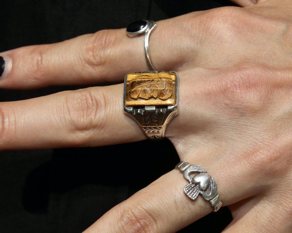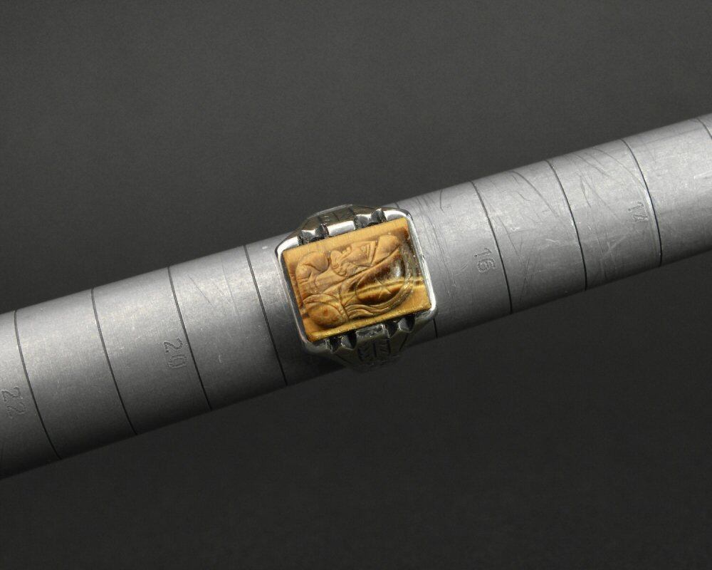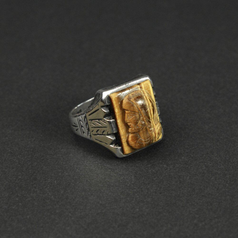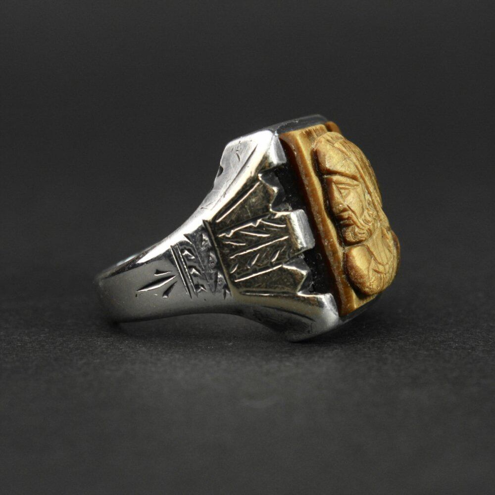 The precious mens cameo ring, Roman Night, has been dug, and the design is seemingly different from the image of a feminine cameo coming and going. The top is a tiger eye with beautiful stripes, which has long been thought of as an eye that sees everything like a tigers eye, and is said to see the essence of things, reject disasters, and be successful. The sides are half gold and well-balanced with the top, giving it an elegant and dignified appearance. Engraved Sterling. Please check the condition in the photo and purchase after understanding the characteristics of vintage.