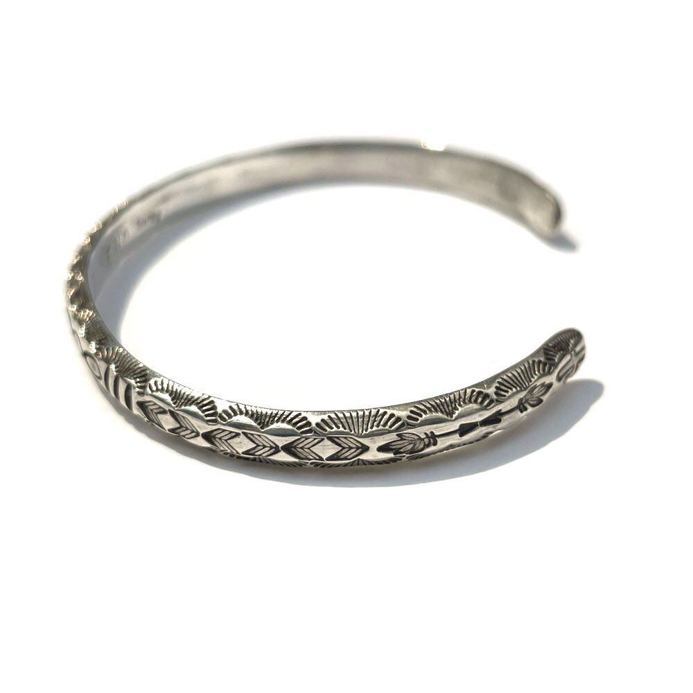 Half moon silver bangle by Navajo female artist ERICKA NICOLAS BEGAY. All of her works use handmade ingot silver, giving off a presence that sets it apart from modern machine-produced Navajo jewelry, and because the plate making is also particular about handmade, there is no one point that is the same. It is a work that makes you feel attached to it because it is a thing. Inspired by the Fred Harvey style that has been around since the 1800s, her work is different from the heavy and profound Navajo jewelery, with a delicate and delicate atmosphere and a stylish yet handmade texture. This half moon type has a narrow silhouette with a rounded and gentle atmosphere. The delicate stamp work unique to women is delicate, and the stamps of authentic Navajo jewelry such as sunlight, rain, and arrows are gently felt. There is no dullness due to oils and chemicals that are common in machine production, and the elegant and beautiful shine unique to handmade, the careful finish feels the delicacy unique to women, and it is a mannish and delicate expression that can be recommended for women as well as layering. We try to make the product photos as close to the actual colors as possible, but the colors may differ from the actual products depending on your monitor settings, room lighting, etc.