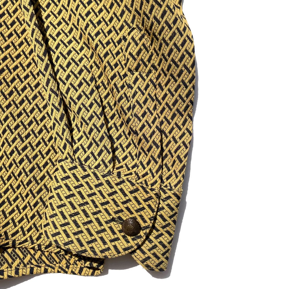 The sharp collar with long points, metal emblem buttons, and mustard yellow with a dull tone give an elegant impression.