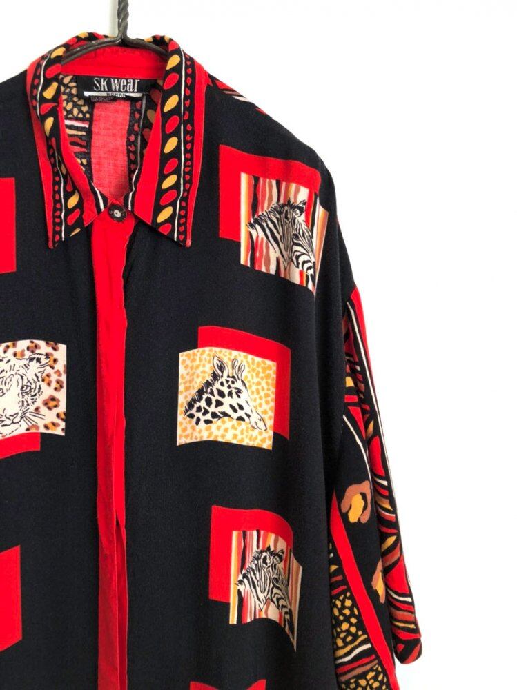 80s short-sleeved rayon shirt Black x red African animal and stripes have an impact. A loose over-silhouette rayon shirt made of rayon fabric that falls softly and softly.