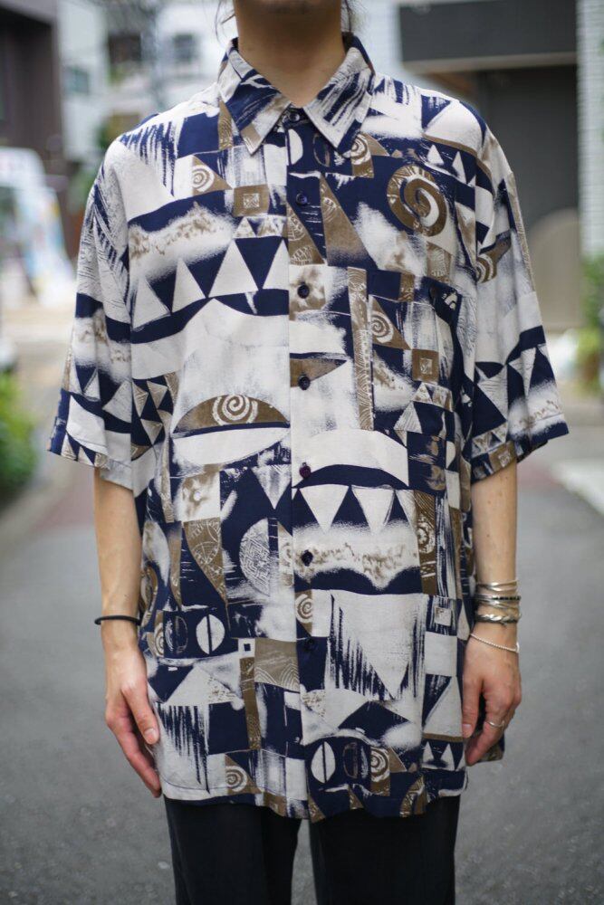 A rayon shirt from the 1980s featuring artistic prints made by the well-established brand Alan Stuart.