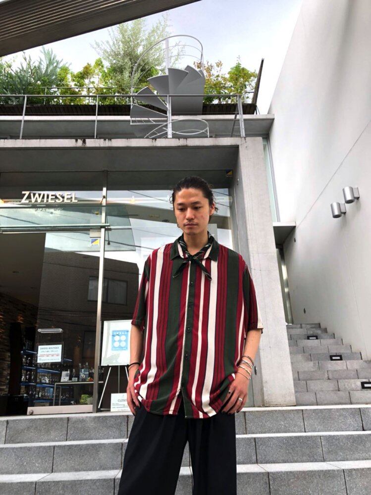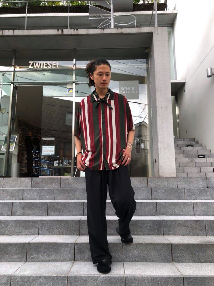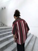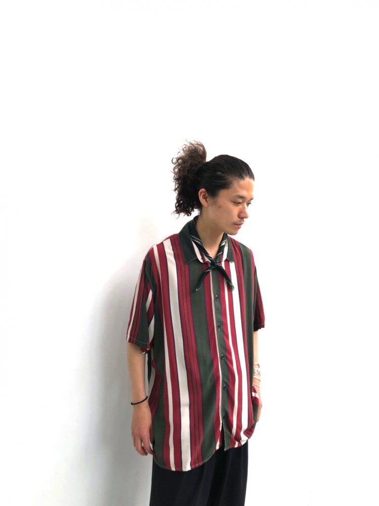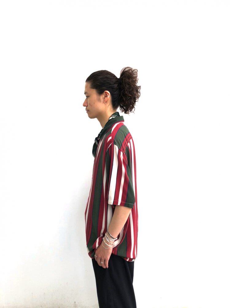90s short-sleeved rayon shirt Green, red, beige tricolor stripes A loose silhouette with just the right amount of space, and a soft, falling fabric that is unique to rayon.