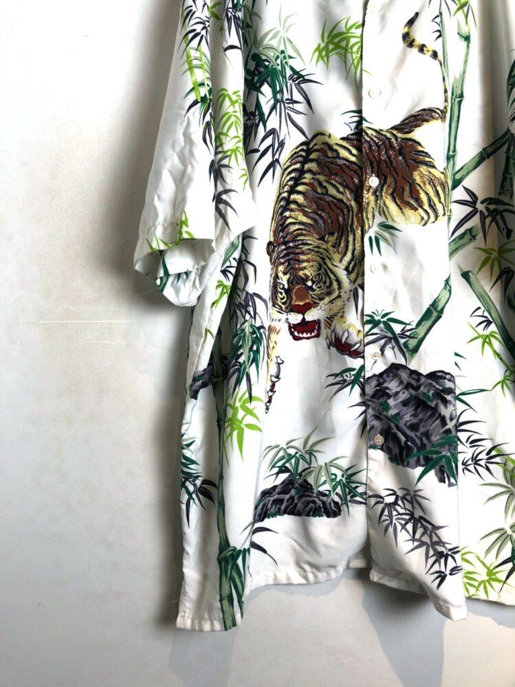 80s Vintage Aloha Shirt A cool tiger and bamboo pattern on a white background. A slightly glossy polyester fabric that feels smooth and smooth to the touch. A loose and voluminous over-silhouette Hawaiian shirt.