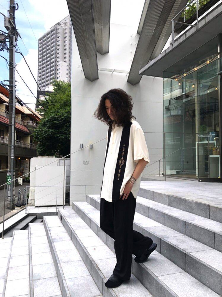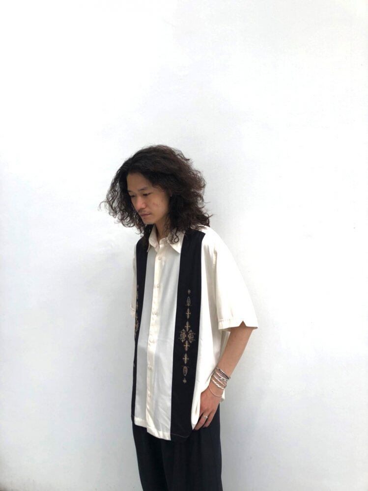90s short-sleeved shirt Off-white body with black stripes by switching panels One rayon x polyester with a nice embroidery on the black stripes A good silhouette shirt