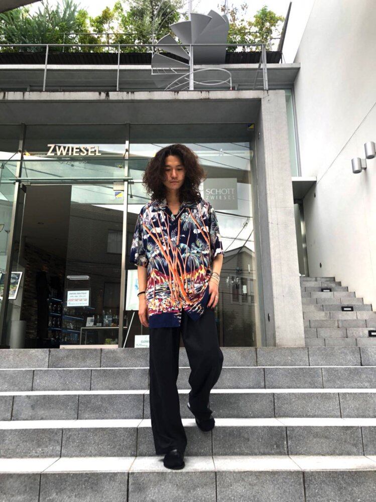 90s Vintage Aloha Shirt Navy-based city pop art palm tree pattern is cool. Over-silhouette Aloha shirt with a relaxed and voluminous feel.