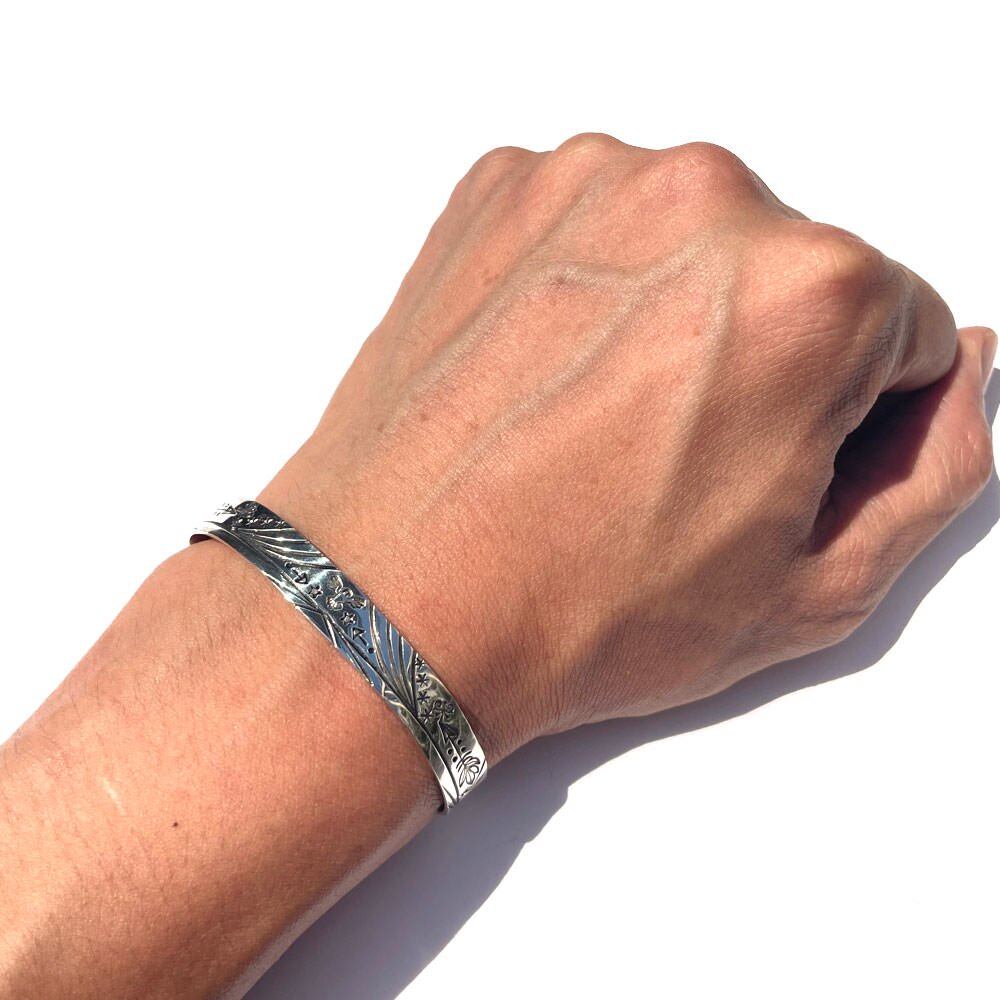 A flat silver bangle by Navajo female artist ERICKA NICOLAS BEGAY. All of her works use handmade ingot silver, giving off a presence that sets it apart from modern machine-produced Navajo jewelry, and because the plate making is also particular about handmade, there is no one point that is the same. Because it is a thing, it is a work that you will love. Inspired by the Fred Harvey style that has been around since the 1800s, her work is different from the heavy and profound Navajo jewelery, with a delicate and delicate atmosphere and a stylish yet handmade texture. This slender flat type has a minimal and delicate urban atmosphere. The delicate stamp work unique to women is delicate, and the stamps of authentic Navajo jewelry such as Thunderbird, Star, and Arrow are gently felt. There is no dullness due to oils and chemicals that are common in machine production, and the elegant and beautiful shine unique to handmade, the careful finish feels the delicacy unique to women, and it is a mannish and delicate expression that can be recommended for women as well as layering. We try to make the product photos as close to the actual colors as possible, but the colors may differ from the actual products depending on your monitor settings, room lighting, etc.