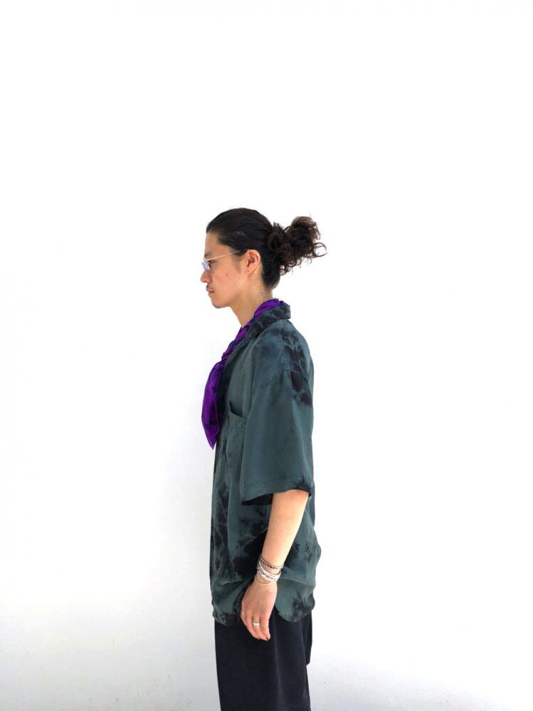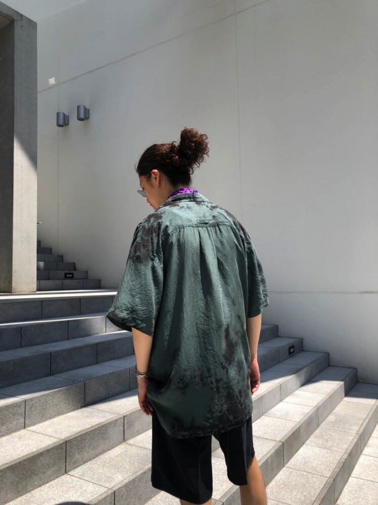 90s short-sleeved silk shirt A silk shirt with a relaxed silhouette that is moderately relaxed. A light and smooth fabric that is unique to silk and has a dark hue with charcoal and black tie dye.