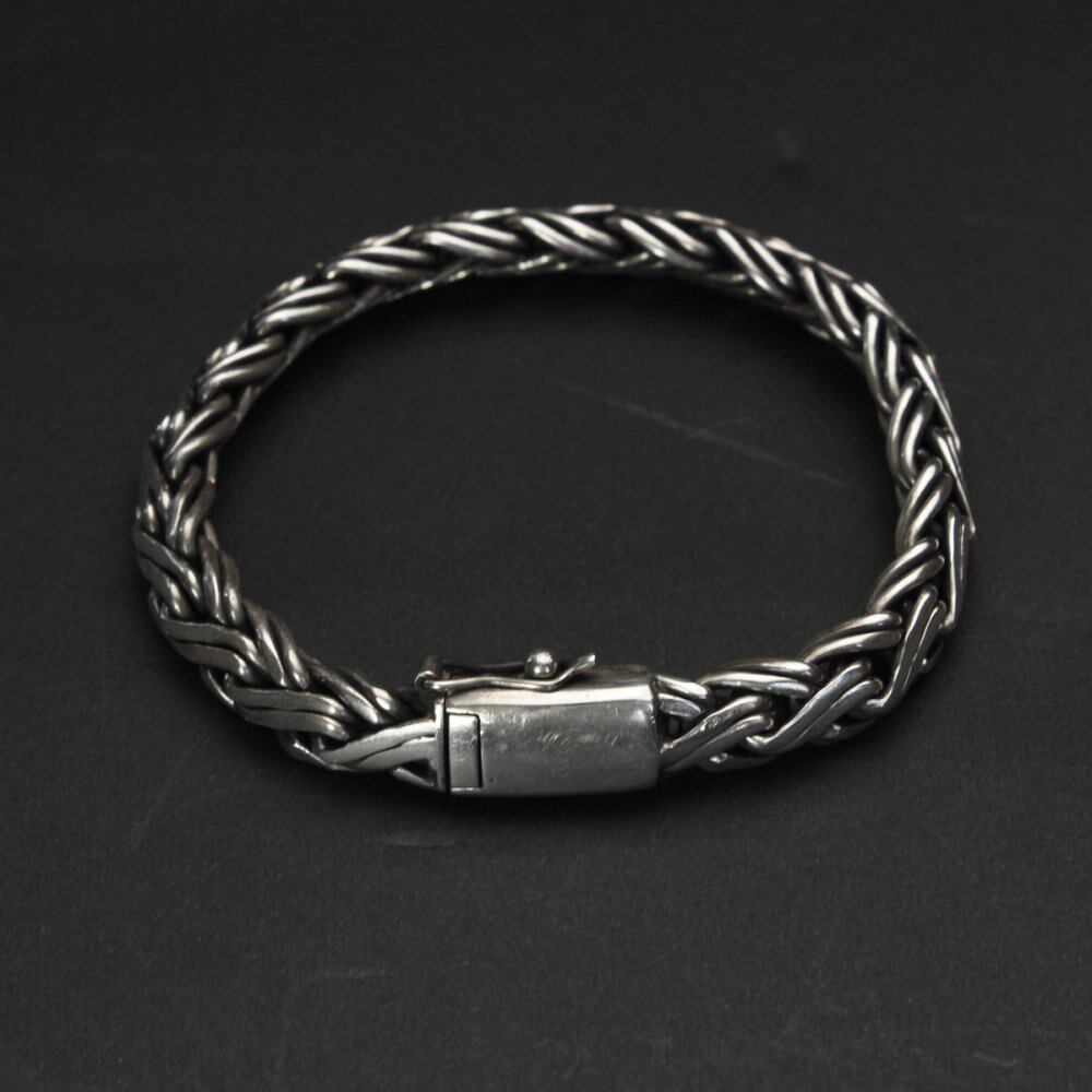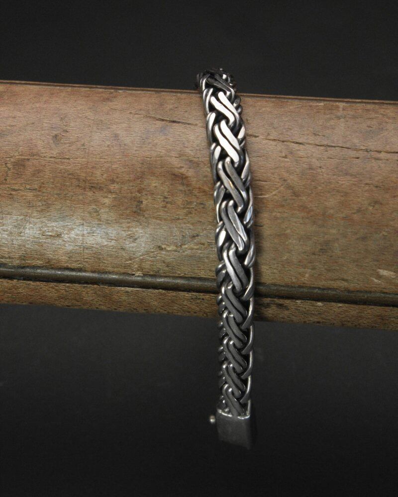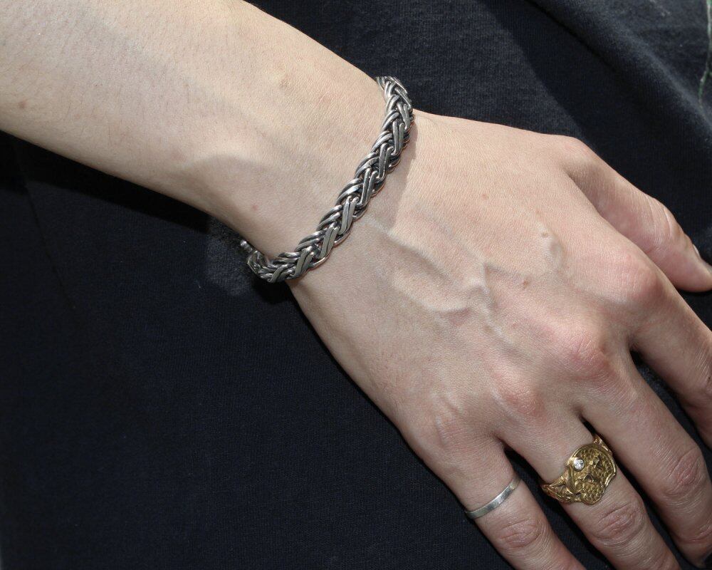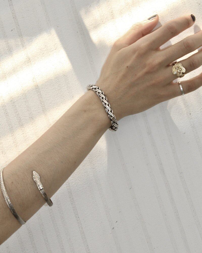 A chain bracelet from the 1970s due to the specifications of the clasp. It seems that it is made in Northern Europe due to the complicated chain structure. The heavy body and dull silver make it look more profound and the minimalist design is an elegant individual. 925 engraved, sterling silver. It is a mechanism that can be removed by pressing the clasp end (□). Since it is old, it may be scratched. Please check the photo and understand the characteristics of vintage before purchasing.