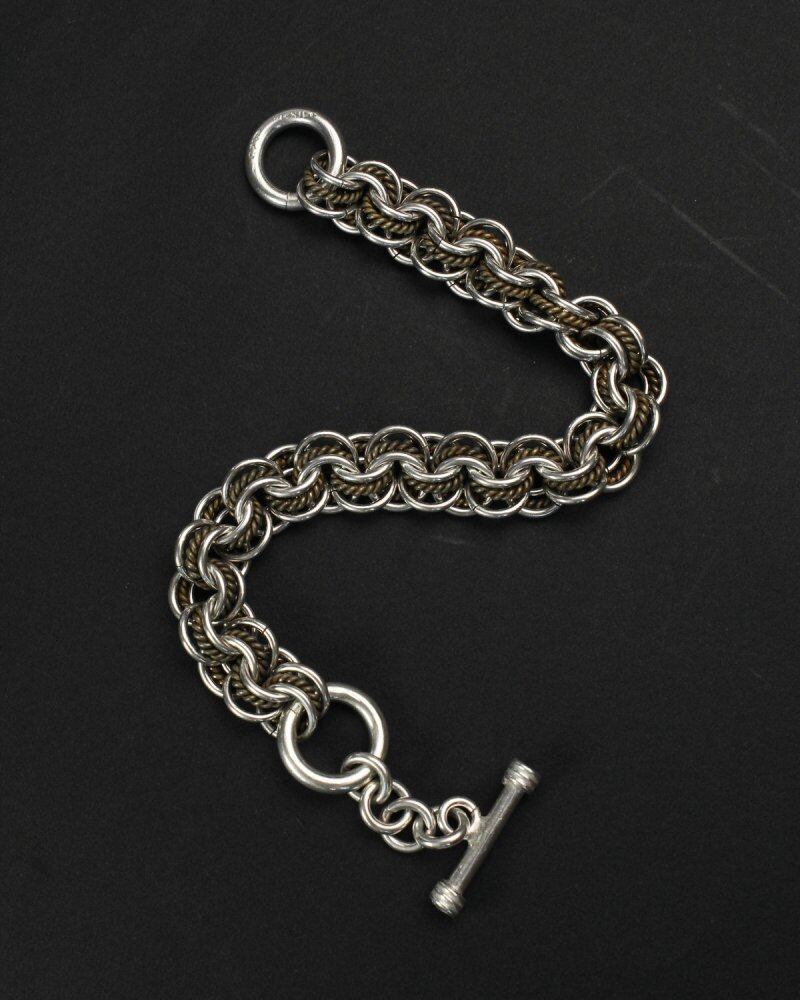 Probably a chain bracelet from the 1980s. It features a structural design like a tire chain in combination with brass. It is a valuable and heavy body, and it is an item that can be completed with one piece with an elegant appearance that is not too strict. The clasp that makes it look more mannish is also a point. 925 engraved, sterling silver. Since it is old, it may be scratched. Please check the photo and understand the characteristics of vintage before purchasing.
