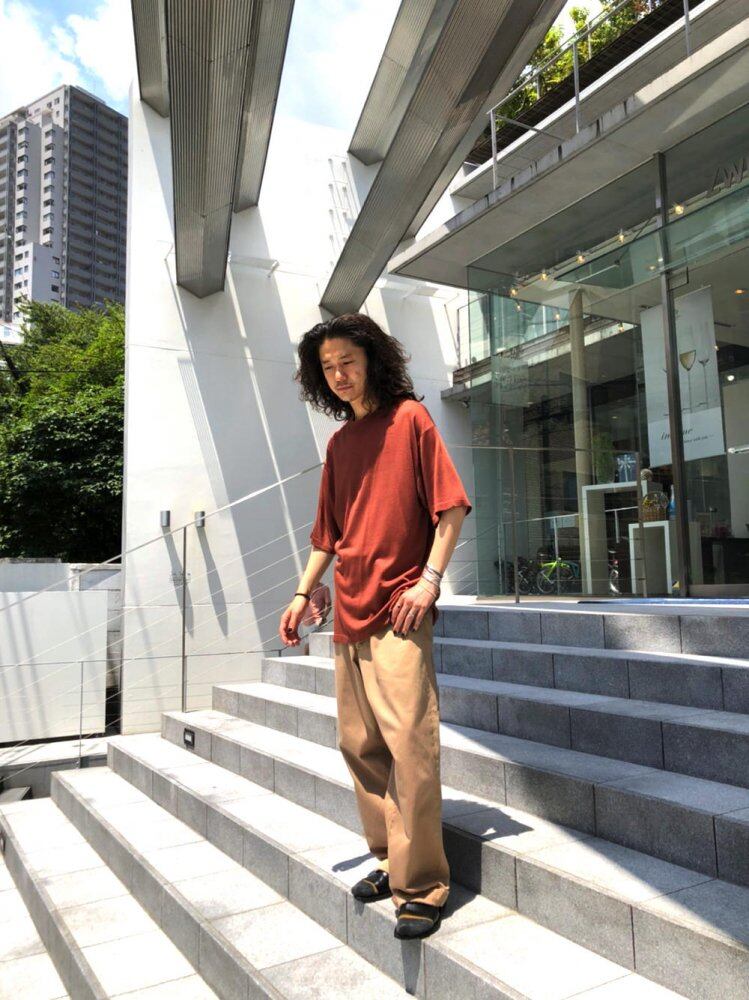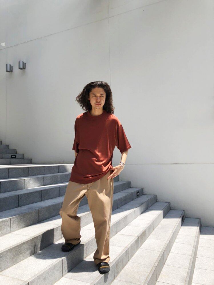 100% silk luxury glossy and smooth knit texture Good brown color with a relaxed and mature silhouette It is the first place that makes a difference in texture to a simple T-shirt style.