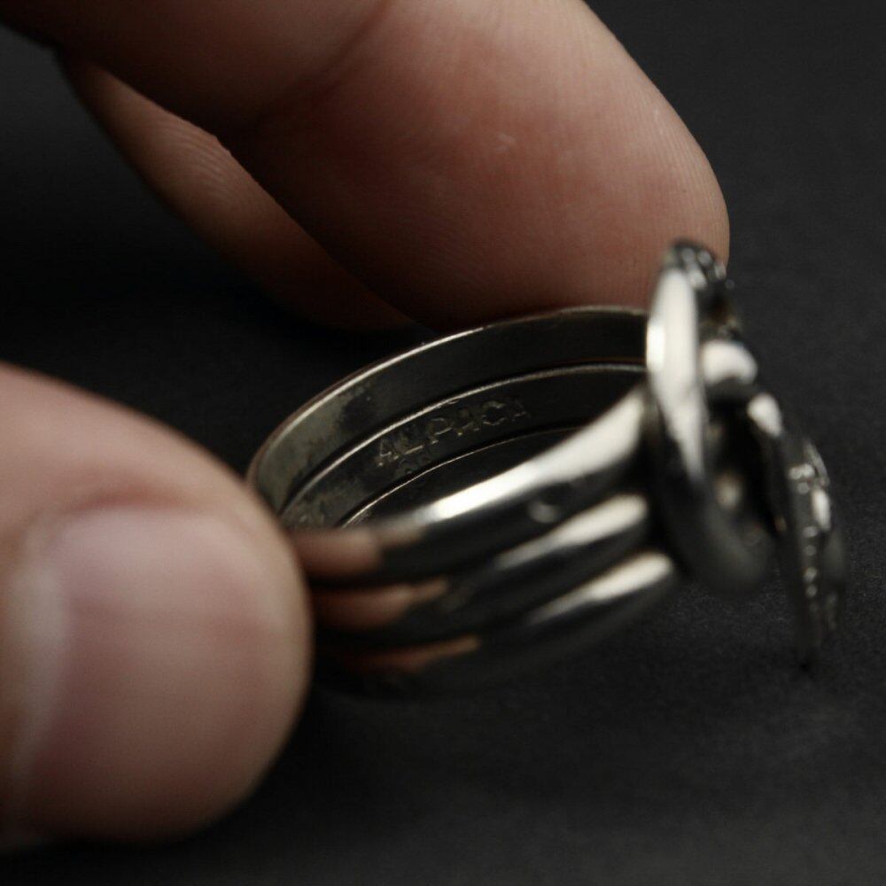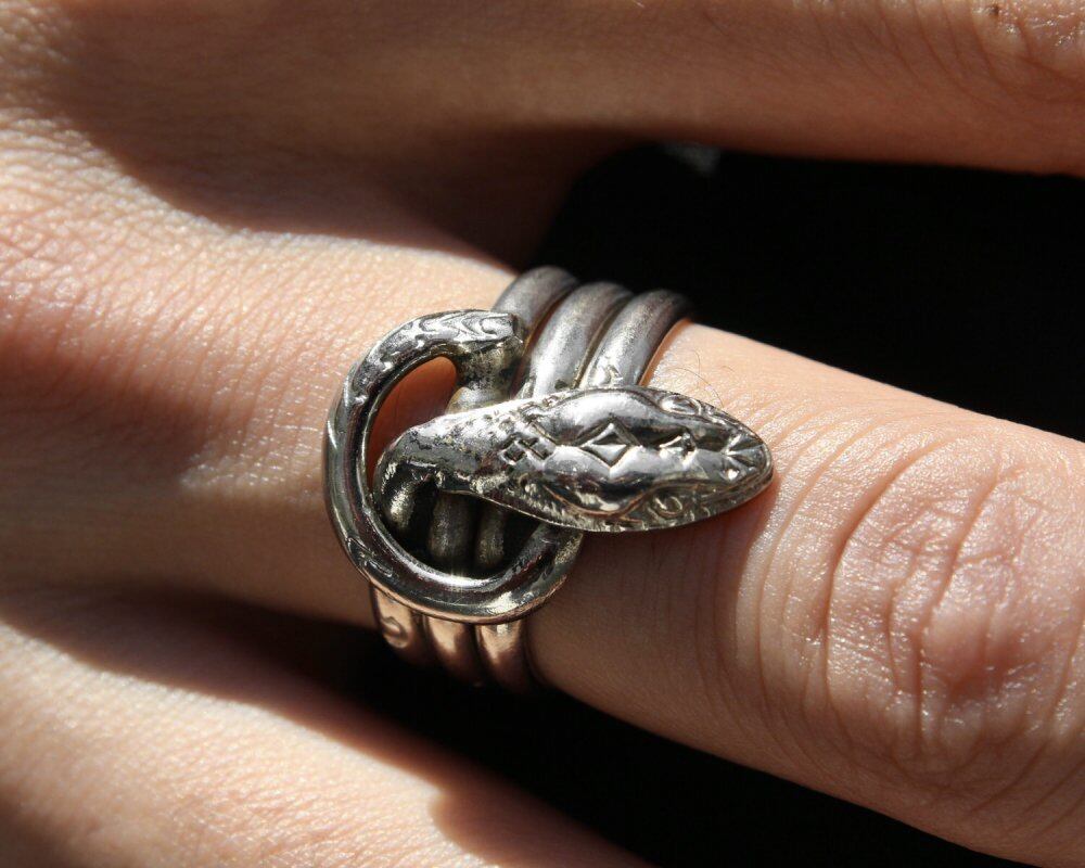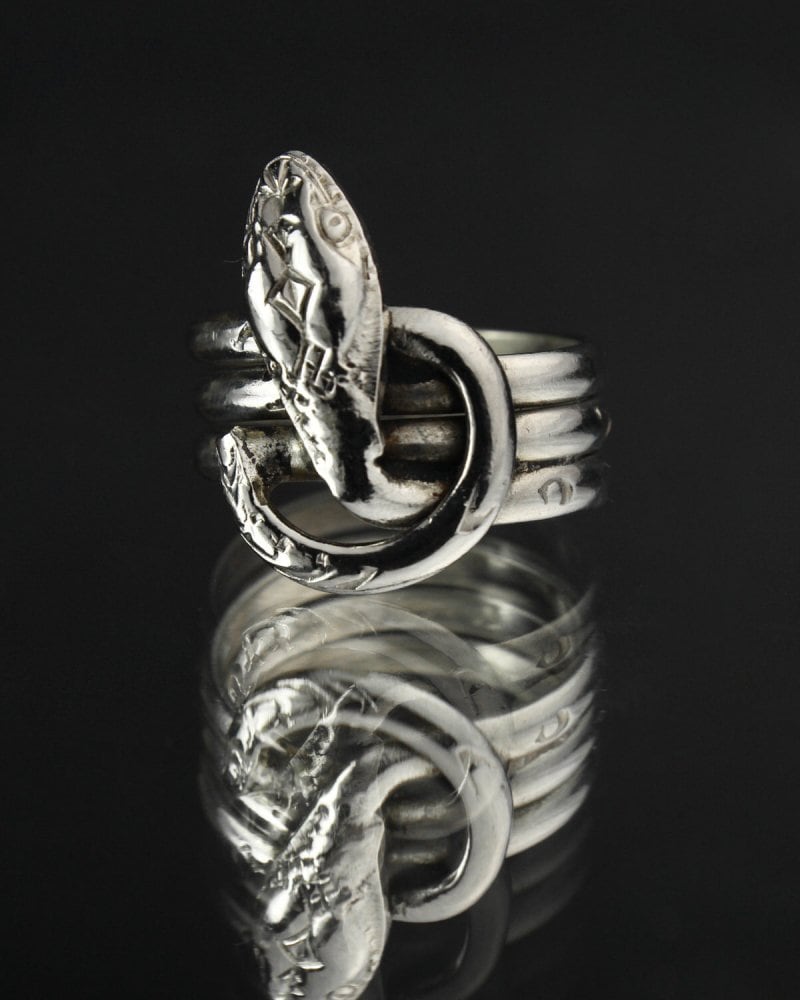 A vintage ring with a rattlesnake motif made in Mexico. It is a motif that has been used for a long time all over the world, meaning reincarnation and eternity, and is sacred in Mexico including the Aztec god Quetzalcoatl. This is a design that is wrapped around a bureau, and features an ethnic look, a profound feeling, and a minimalist appearance. An alloy material of silver and other precious metals called alpaca silver, which is rare. Please check the condition in the photo and purchase after acknowledging the characteristics of vinteg.