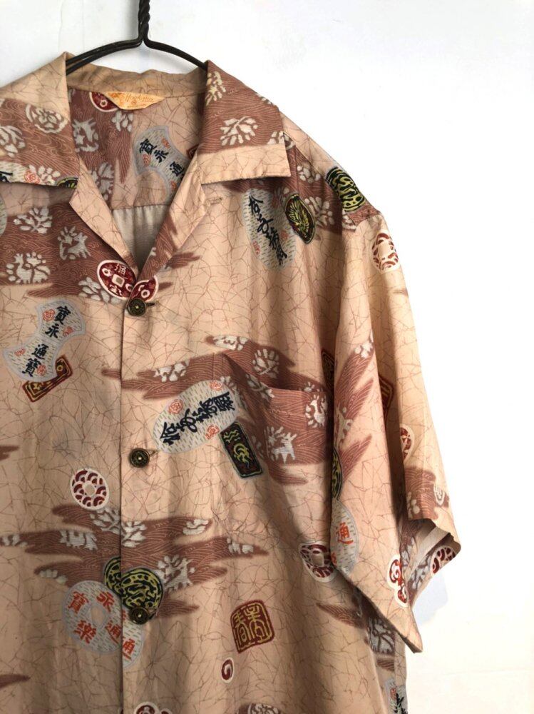 60s Vintage Aloha Shirt Light and smooth 100% silk luxury vintage Aloha Beige color printed Kanei Tsuhos Japanese pattern is astringent 1st place (buttons are also Kanei Tsuhos design with a sense of size that is reasonably generous A well-balanced good silhouette first place