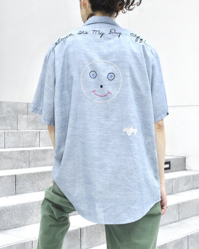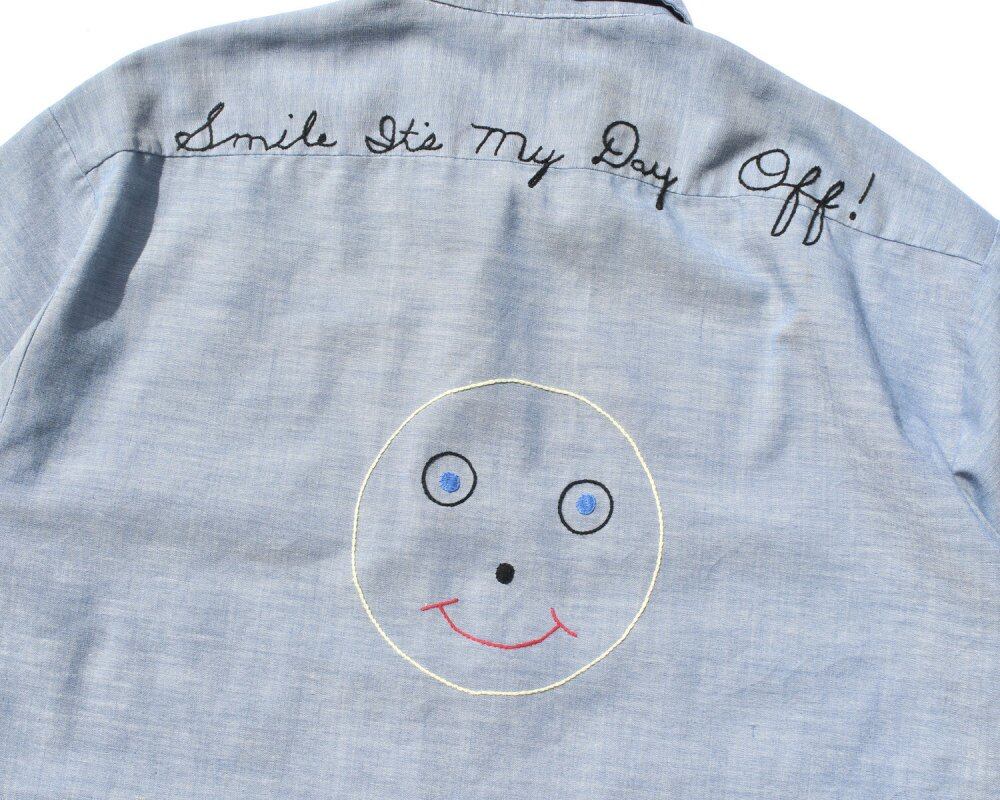 It is a work shop around the 1970s. The soft and light chambray fabric of cotton and polyester has a comfortable texture. It is aged as a whole and has a more vintage appearance. This is a rare type with a loose embroidery that gives an innocent and kitsch impression, and the edges of each part are also embroidered. A relaxed silhouette that is valuable for vintage chambray shirts. There is no difference between the top and bottom of the front button, the missing button in the pocket, and no other major damage. Since it is an old product, it rarely deteriorates over time. Please check the photo and purchase after acknowledging the characteristics of vintage.