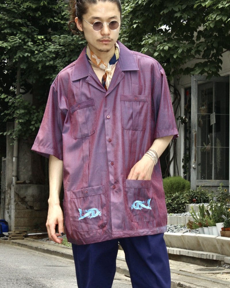 A Cuban shirt style short sleeve shirt from the 1980s. The cotton / polyester fabric with mint blue for the weft and Bordeaux for the warp has an erotic look. It has a crispy texture, silk touch, and a light texture. The resort-like design like a Cuban shirt and the embroidery of the dragon embroidered in the pocket are also points of unusual specifications. A moderately loose silhouette. It is in good condition subjectively. Since it is an old product, it rarely deteriorates over time. Please check the photo and purchase after acknowledging the characteristics of vintage.
