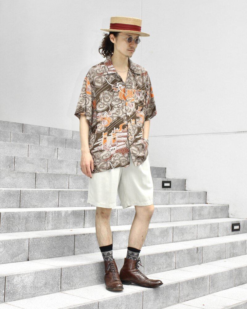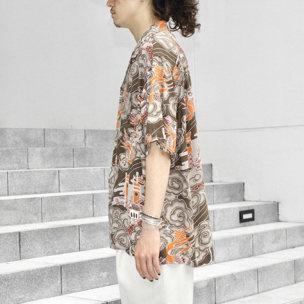 Hawaiian shirts from the 1980s. Following the old-fashioned Hawaiian shirt, crepe silk fabric is used to give it a crisp, cool and soft feel. Deep brown-based coloring with Japanese design for dragons, clouds and castles, and high quality prints. In recent years, well-designed items have been soaring in the United States even in this age group, and it has become difficult to find them. Although it is L size, it has a wider and more relaxed silhouette. It is in good condition subjectively as used clothing. Since it is an old product, it rarely deteriorates over time. Please check the photo and purchase after acknowledging the characteristics of vintage.
