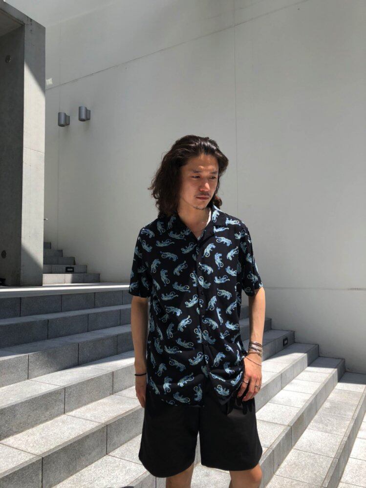 A cute blue tiger pattern that shines in the black color of the short-sleeved shirt body of the 80s.